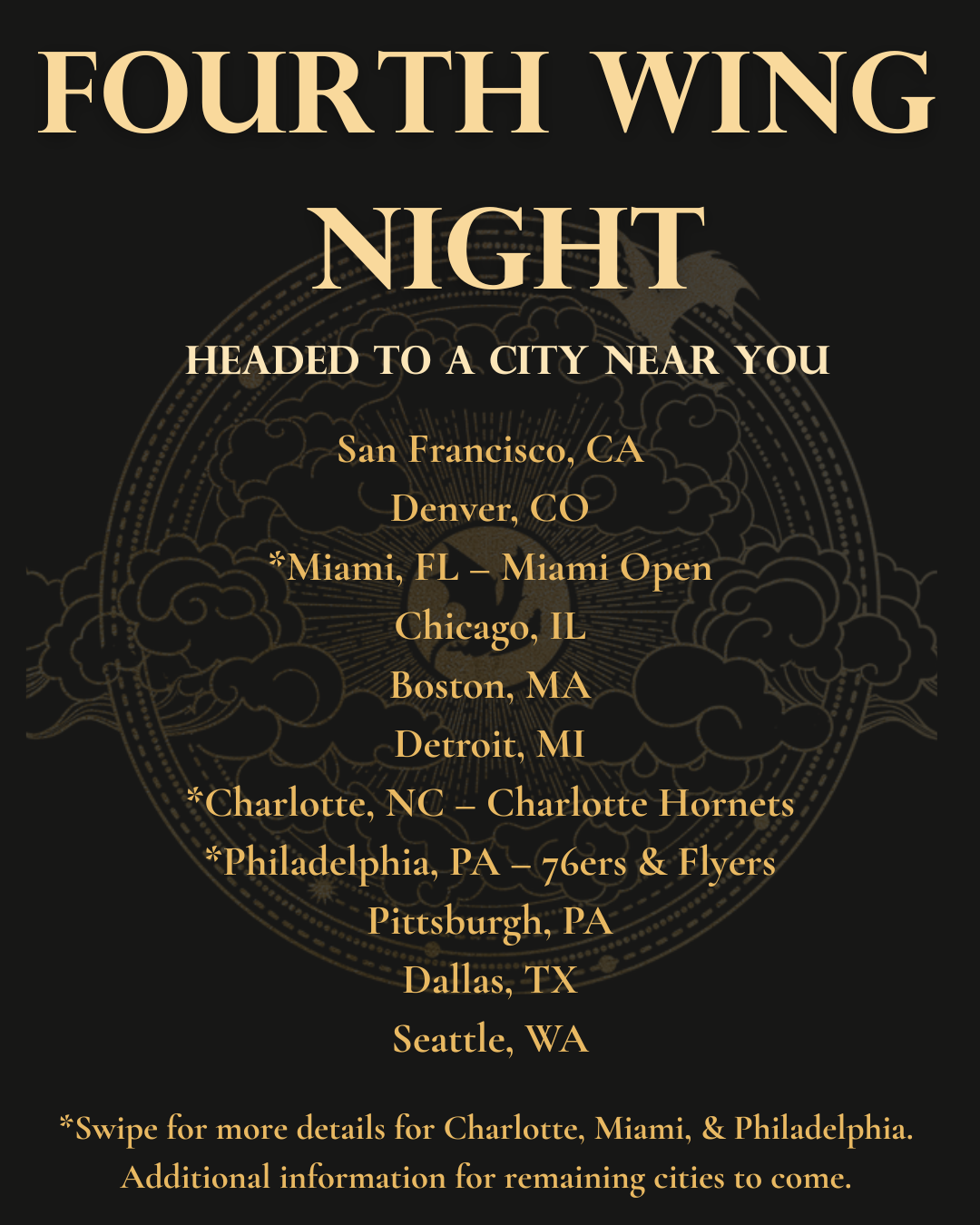 Fourth Wing Night at Ball Arena in Denver, CO is on April 8! Tickets will go on sale Friday, December 12 at 10 am MT (12 pm ET / 9 am PT). You can click the link below to see more about the event and what the ticket packages include, and to sign up to receive the ticket link the day of the sale.